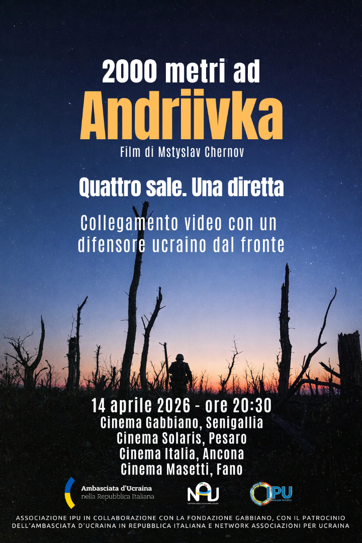 Un appuntamento che unisce cinema, testimonianza diretta e partecipazione collettiva. Martedì 14 aprile 2026, alle ore 20.30, nelle Marche sarà proiettato in contemporanea in quattro diverse sale il film “2000 metri ad Andriivka”, iniziativa promossa dall’Associazione Insieme Per Ucraina – IPU (ODV) in collaborazione con la Fondazione Gabbiano.