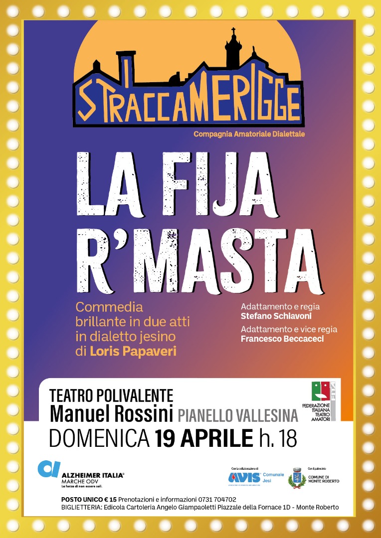 PIANELLO VALLESINA (An) – Un pomeriggio di teatro, tradizione e solidarietà per sostenere le attività dell’Associazione Alzheimer Marche. Domenica 19 aprile 2026, alle ore 18, alla Sala polivalente “Manuel Rossini” di Pianello Vallesina, andrà in scena “La fija r’masta”, commedia dialettale brillante in due atti scritta da Loris Papaveri, con la regia di Stefano Schiavoni e interpretata dalla compagnia I Straccamerigge.