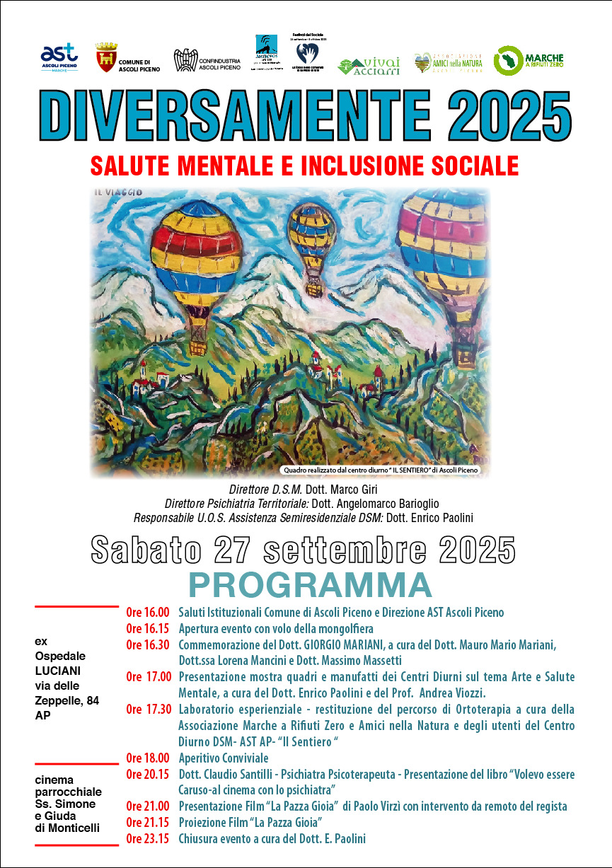 Si parte il 26 settembre con una giornata dedicata all’artigianato sociale e al progetto “Telefono Argento” presso la Sala Cola d’Amatrice, iniziativa che unisce creatività e supporto alle fragilità. Sabato 27 sarà la volta di “Diversamente”, l’evento per la promozione della salute mentale e l’inclusione sociale, che si aprirà simbolicamente con il volo di una mongolfiera, seguito da una mostra d’arte curata dagli utenti dei Centri diurni. Tra i momenti salienti, un laboratorio di ortoterapia, l’aperitivo conviviale e, in serata, la presentazione di un libro autobiografico e la proiezione del film “La Pazza Gioia” di Paolo Virzì, con intervento del regista.