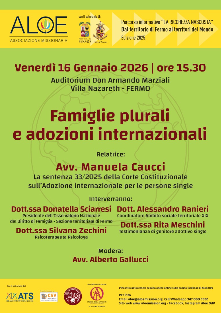 Il gruppo FAMIGLIE PER L’ADOZIONE dell’associazione ALOE OdV organizza per Venerdì 16 Gennaio 2026, alle ore 15.30 presso l’Auditorium Don Armando Marziali di Villa Nazareth un convegno sulla recente sentenza della Corte Costituzionale n. 33 del 2025 relativa alla possibilità per le persone single di poter accedere all’Adozione Internazionale. Si tratta di una novità assoluta passata per lo più sotto silenzio o di cui si sono accorti solamente gli addetti ai lavori. Il titolo del convegno “Famiglie plurali e Adozione Internazionale” è quanto di più attuale ci possa essere in questo nostro tempo di profonde trasformazioni, fra cui anche il concetto e la stessa realtà di famiglia. Secondo le più recenti statistiche ormai in Italia una famiglia su dieci è una famiglia monoparentale e questo sta ormai diventando un fenomeno assolutamente normale. Tutto questo non può non incidere anche sulla realtà dell’adozione ed è per questo che la recente sentenza della Corte costituzionale a proposito della possibilità dell’adozione aperta anche ai single diventa una questione importante. Il presente convegno pertanto appare estremamente interessante perché rappresenta una prima assoluta per permettere all’intera società civile di prendere consapevolezza. Il convegno è parte di un percorso formativo sostenuto dal CSV Marche nell’ambito dei percorsi di formazione partecipata; ed è sponsorizzato fra l’altro dall’Ordine degli Avvocati che lo ha accreditato per la formazione dei suoi aderenti con 3 crediti formativi. L’Ambito territoriale sociale (ATS) XIX ha offerto il suo patrocinio.