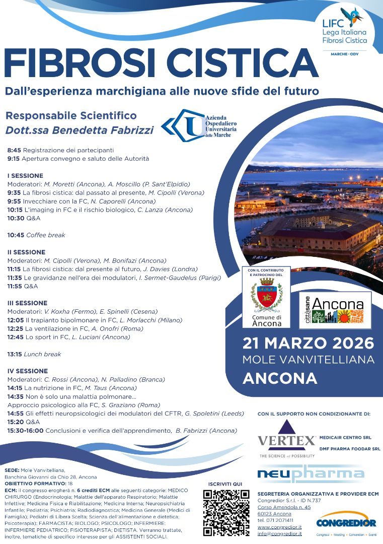 L’iniziativa è promossa dalla Lega Italiana Fibrosi Cistica Marche Odv, in collaborazione con il Centro Fibrosi Cistica, con il patrocinio del Comune di Ancona e dell’AOU delle Marche. Il convegno rappresenta un’importante occasione di aggiornamento e dialogo, pensata per diffondere conoscenza, rafforzare la rete territoriale e accendere i riflettori su una patologia complessa e spesso poco riconoscibile all’esterno, ma che richiede un percorso di cura continuo e multidisciplinare.
