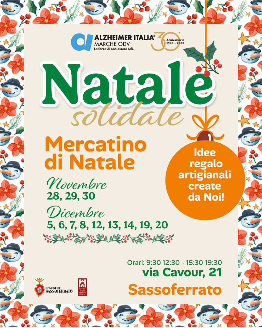 - a Sassoferrato è il 5, 6, 7, 8, 12, 13, 14, 19 e 20 dicembre 2025, appuntamento in via Cavour, 21 per sostenere nel 2026 attività come il Caffè Alzheimer, Fitness per la Terza Età, Sportello Informativo, Sorrisi e Sollievo, Un sostegno a chi Sostiene