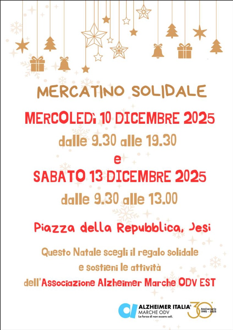- a Jesi, mercoledì 10 dicembre dalle ore 9:30 alle ore 19:30 e sabato 13 dicembre dalle ore 9:30 alle ore 13:00, appuntamento in Piazza della Repubblica, per sostenere attività come Caffè Alzheimer, Sorrisi e Sollievo, Gruppo di Auto Mutuo Aiuto.
