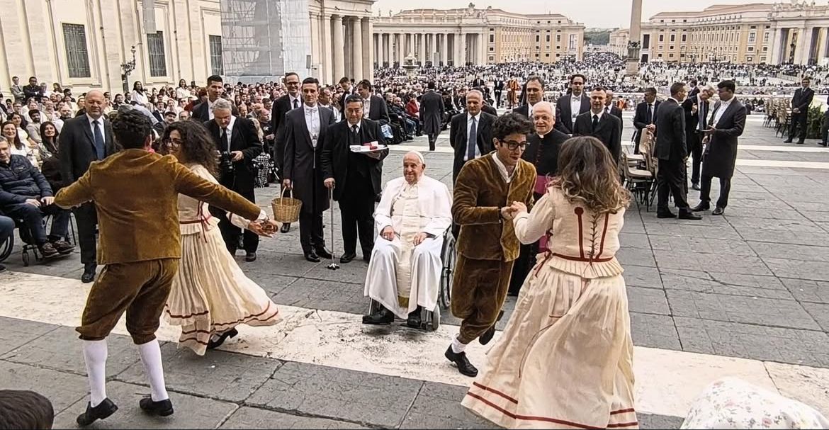 A Roma, lo scorso 16 ottobre, il gruppo Ortensia è stato per incontrare il Papa. “Inizialmente – spiega la ragazza –, dovevamo stare nel settore per i vari gruppi. Poi, io ho spinto per voler incontrare il Papa e, tra mille peripezie, alla fine siamo riusciti a farci accogliere. Abbiamo ballato e cantato. Lui batteva i piedi e le mani al ritmo del Saltarello. Era in sedia a rotelle, ma, nonostante tutto, si è divertito. Ci ha dato la benedizione. Ai bimbi ha dato tantissime caramelle. È stata la mia prima volta dal Papa e sicuramente sarà un ricordo indelebile”.