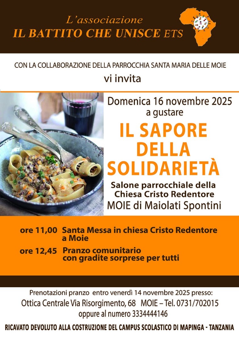 invita la cittadinanza a partecipare all’iniziativa “Il sapore della solidarietà”, che si terrà domenica 16 novembre 2025 al salone parrocchiale della Chiesa Cristo Redentore a Moie di Maiolati Spontini.