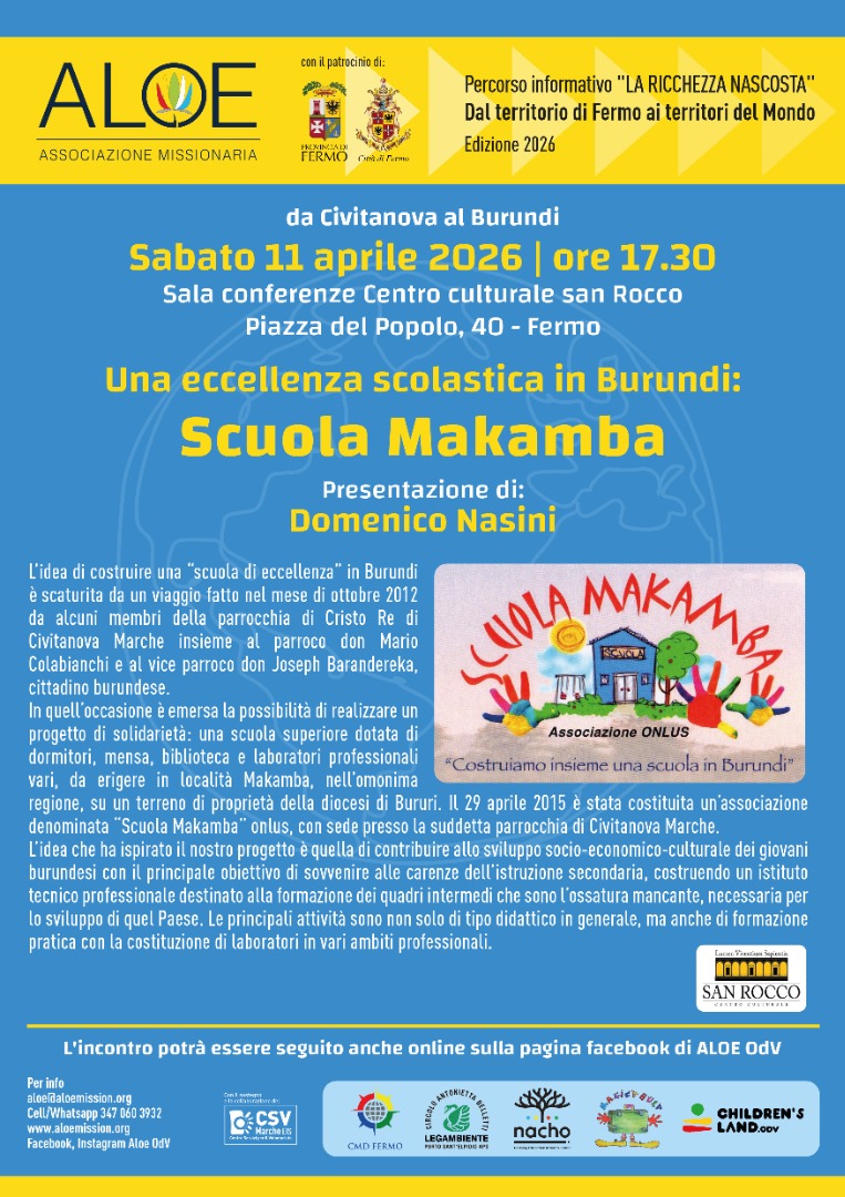 SABATO 11 APRILE 2026, alle ore 17.30 presso la SALA CONFERENZE del CENTRO CULTURALE SAN ROCCO, Piazza del Popolo, 40 – FERMO, si parlerà di “ECCELLENZA SCOLASTICA IN BURUNDI” a patire dall’esperienza della “SCUOLA MAKAMBA” con un intervento di DOMENICO NASINI.