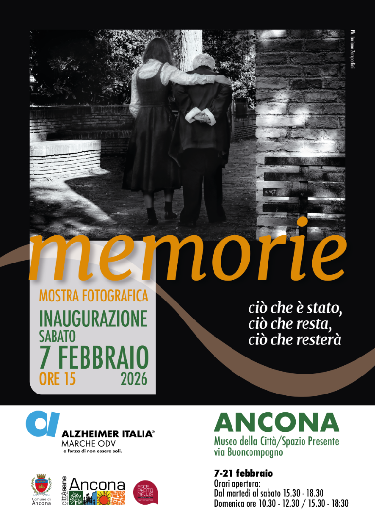 “Memorie” è un viaggio tra la bellezza e la fragilità della memoria condivisa dalle persone con Alzheimer, dai loro familiari e dagli operatori che ogni giorno le accompagnano con dedizione, forza e affetto. La mostra, promossa da Alzheimer Marche ODV ETS insieme al Comune di Ancona, resterà esposta dal 7 al 21 febbraio (dal martedì al sabato, dalle 15,30 alle 18,30 e la domenica dalle 10,30 alle 12,30 e dalle 15,30 alle 18,30) a “Spazio Presente” di Via Buoncompagno, Museo della Città. L’ingresso è gratuito.
