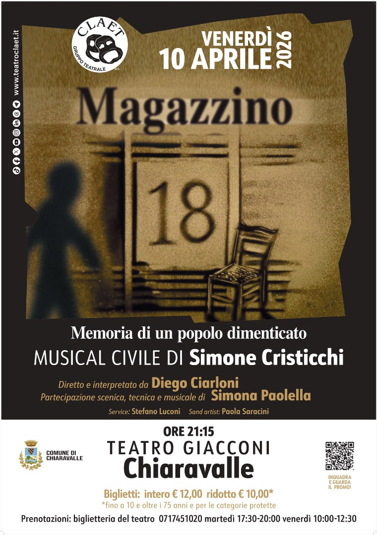 Una pagina dolorosa della storia italiana che torna a parlare al presente attraverso il teatro. Venerdì 10 aprile, alle ore 21.15, il Teatro Giacconi di Chiaravalle ospiterà Magazzino 18, intenso spettacolo di teatro civile ideato da Simone Cristicchi e dedicato alla memoria dell’esodo giuliano-dalmata.