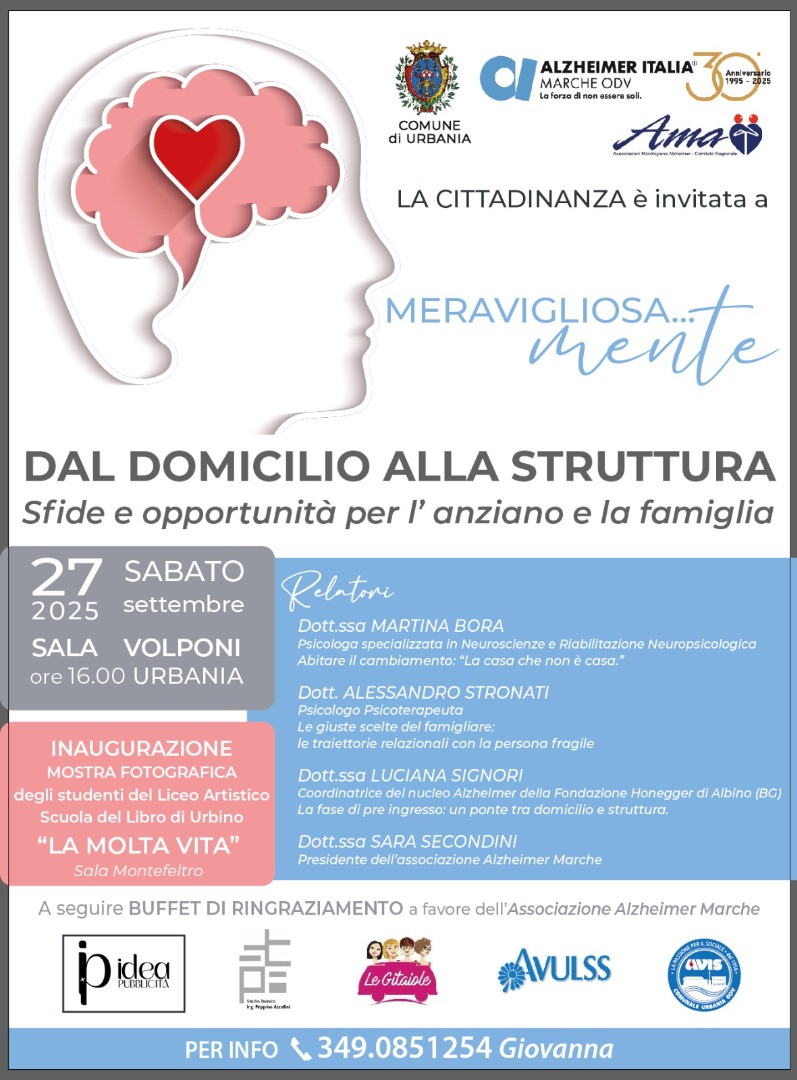 Sabato 27 settembre 2025, alle ore 16.00, nella Sala Volponi di Urbania, si terrà l’iniziativa pubblica “Meravigliosa…mente – Dal domicilio alla struttura. Sfide e opportunità per l’anziano e la famiglia”, un momento di riflessione e confronto dedicato ai temi dell’invecchiamento e della cura delle persone fragili.