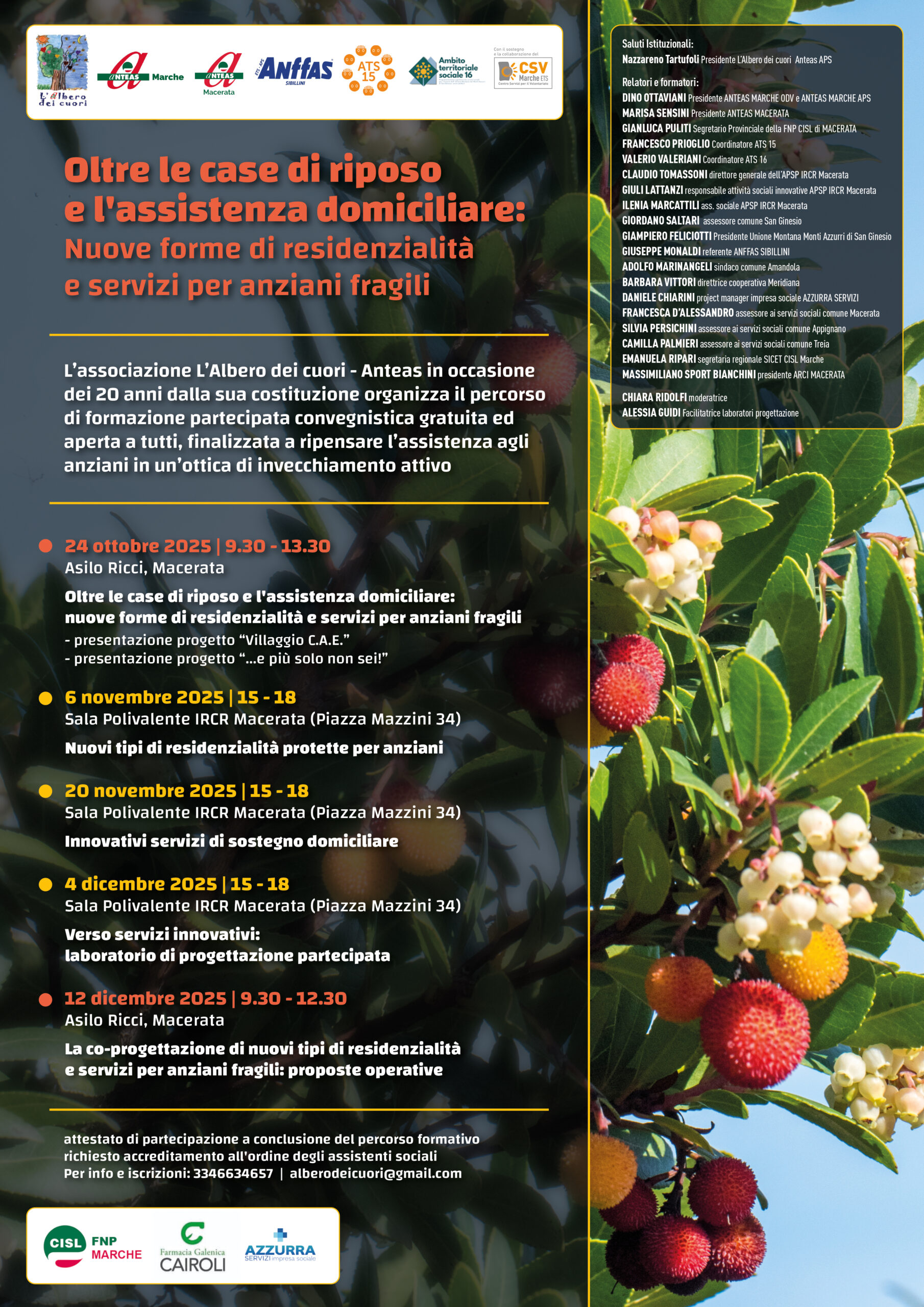 L’iniziativa è promossa dall’associazione di promozione sociale L’Albero dei cuori – Anteas APS congiuntamente con il Centro Servizi Volontariato Marche, in un’azione sinergica che unisce esperienza associativa, volontariato organizzato e competenze formative. Il progetto vede inoltre il prezioso partenariato di Anteas Marche ODV, Anteas Marche APS, Anteas Macerata e Anffas Sibillini, nonché quello dell’ATS 15 di Macerata e dell’ATS 16 di San Ginesio e la collaborazione di FNP CISL Marche, a garanzia di un approccio multisettoriale e inclusivo.