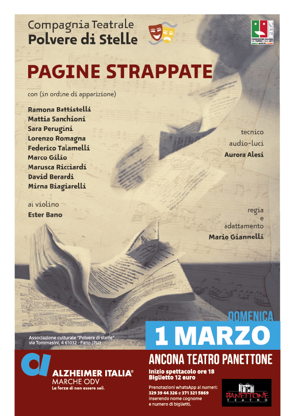 Un’iniziativa per accendere i riflettori sull’Alzheimer, sui bisogni dei malati e sul percorso spesso complesso delle famiglie impegnate nella cura e nell’assistenza. Domenica 1 marzo 2026, alle 18:00, al Teatro “Panettone” di Ancona, Associazione Alzheimer Marche Odv Ets promuove lo spettacolo teatrale di beneficenza “Pagine Strappate”.