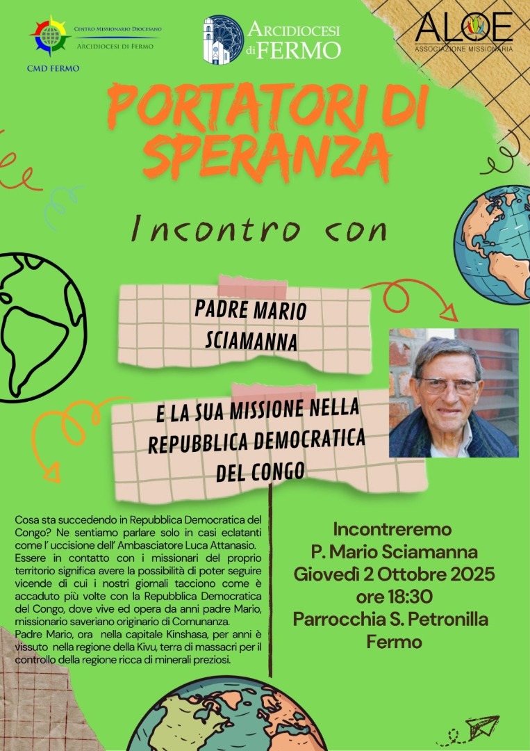 Essere in contatto con i missionari del proprio territorio significa avere la possibilità di conoscere vicende di cui spesso i nostri media non parlano. È il caso della Repubblica Democratica del Congo, teatro di violenze e massacri di cui si discute poco in Italia, ma che rappresentano una drammatica realtà quotidiana. Qui opera Padre Mario Sciamanna, che l’Associazione missionaria Aloe ha invitato in un incontro pubblico, giovedì 2 ottobre 2025, alle ore 18.30, nella Parrocchia di Santa Petronilla a Fermo, aperto a tutta la cittadinanza.  L’appuntamento è in collaborazione con il Centro Missionario Diocesano di Fermo. Con il titolo con il titolo: “Portatori di speranza. Incontro con p. Mario Sciamanna e la sua missione nella R.D. del Congo“.