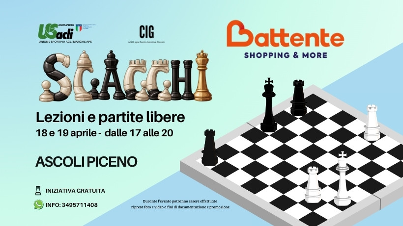 Sabato 18 e domenica 19 aprile 2026, gli spazi del Centro commerciale Battente si trasformeranno in una grande scacchiera aperta alla cittadinanza L’iniziativa, promossa dall’U.S. Acli Marche Aps in collaborazione con l’Associazione Centro Iniziative Giovani Aps e il Centro commerciale Battente, si pone l’obiettivo di stimolare le facoltà cognitive attraverso il gioco degli scacchi, favorendo al contempo la socializzazione tra generazioni diverse. Dalle ore 17:00 alle 20:00 di entrambe le giornate, saranno allestite postazioni con tavoli e scacchiere a disposizione dei visitatori. L’evento è strutturato per accogliere partecipanti di ogni livello: