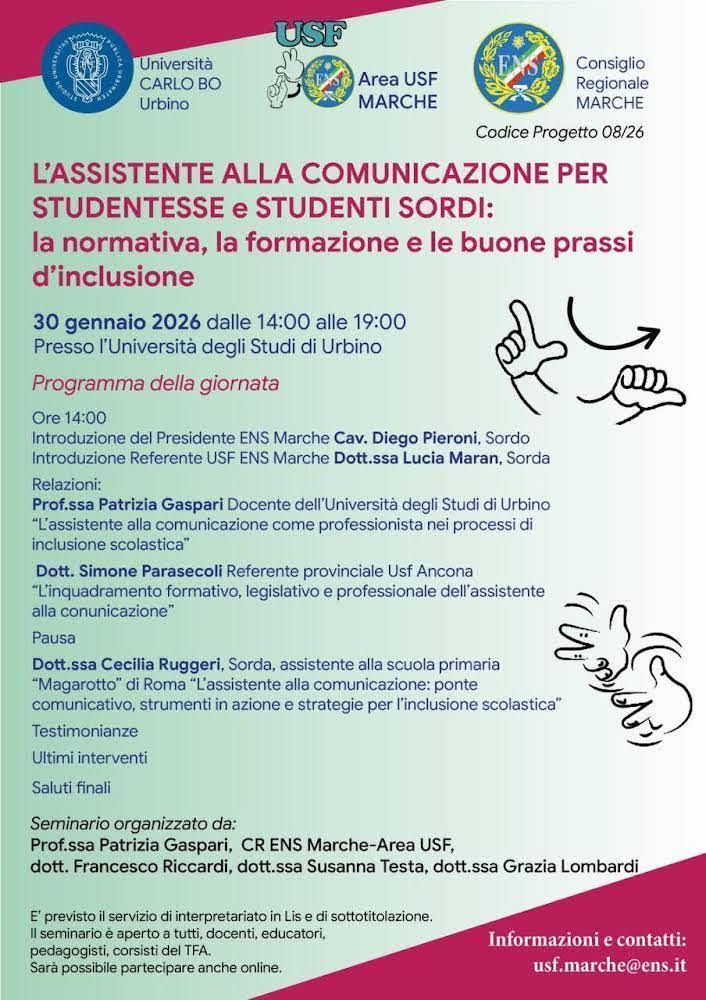 Venerdì 30 gennaio 2026, dalle ore 14.00 alle 19.00, si terrà a Urbino il seminario dedicato alla figura dell’Assistente alla Comunicazione per studenti e studentesse sorde, un’importante occasione di approfondimento, formazione e confronto per il mondo della scuola e dell’educazione.