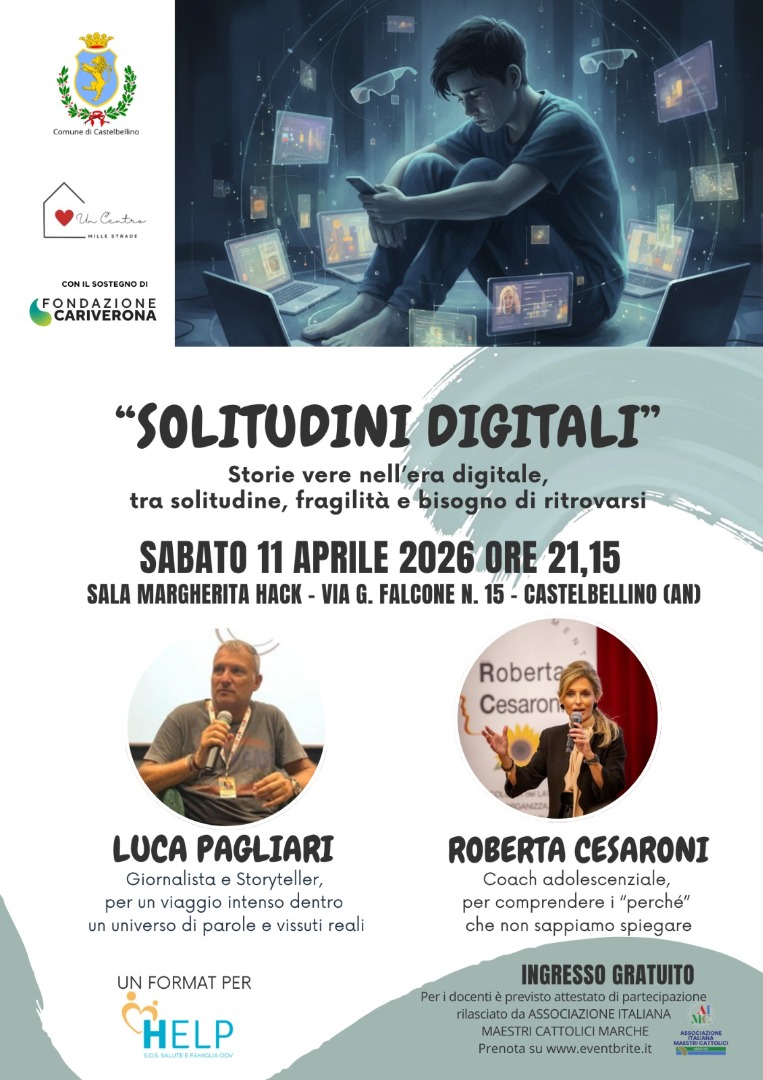 Sabato 11 aprile, alle ore 21.15, la Sala Margherita Hack di Castelbellino ospiterà “Solitudini digitali”, uno spettacolo intenso e coinvolgente che affronta uno dei temi più delicati e attuali del nostro tempo: il rapporto tra tecnologia, fragilità e solitudine.