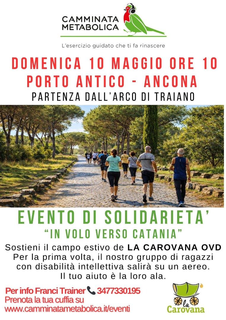 ANCONA – Attività fisica, solidarietà e inclusione si incontrano al Porto Antico di Ancona con “Camminata Metabolica – evento solidale”, un’iniziativa promossa da La Carovana Odv in collaborazione con Camminata Metabolica, con l’obiettivo di raccogliere fondi a sostegno del campo estivo dell’associazione.